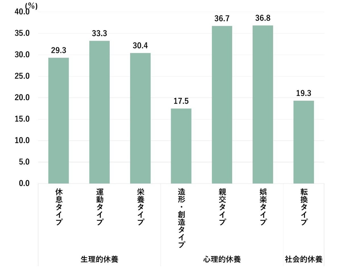 休養学基礎で定義した、休養の7タイプの2021年の実施状況を見ていくと、生理的休養の休息タイプ29.3%、運動タイプ33.3%、栄養タイプ30.4%、心理的休養の造形・創造タイプ17.5%、親交タイプ36.7%、娯楽タイプ36.8%、転換タイプ19.3%という結果となった。