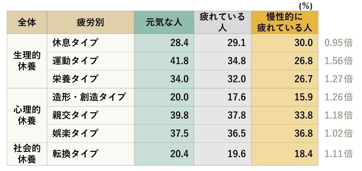 疲労度合別で見ていくと、慢性的に疲れている人は、休息タイプの実施率が元気な人よりも高い結果になり、休養の多様化よりも休むことが第一優先に考えている。また、最も行動率が多い娯楽タイプは、疲労度合での差がほとんどなく、取り入れ方の質・量を考えて行動することが必要かもしれません。元気な人がより実践している休養行動は、運動タイプの1.56倍、次いで栄養タイプの1.27倍、造形・創造タイプの1.26倍となっており、特に日本人の実施率が低い造形・創造タイプを取り入れることが、今後の抗疲労(疲労解消)アプローチで重要な要素になるのではと推測される。
