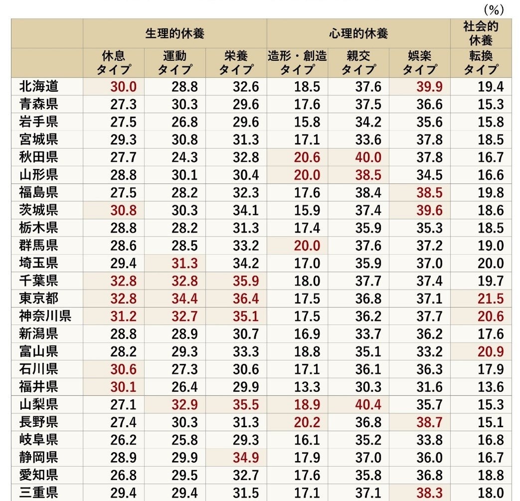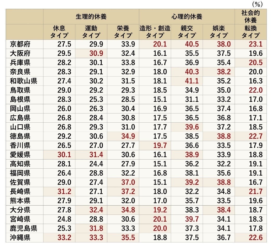 休養の7タイプの実施状況が高い都道府県を見ていくと、休息タイプは沖縄県、東京都、千葉県、運動タイプは東京都、沖縄県、山梨県、栄養タイプは長崎県、佐賀県、東京都、造形・創造タイプは、秋田県、長野県、京都府、宮崎県、親交タイプは和歌山県、京都府、山梨県、娯楽タイプは北海道、茨木県、徳島県、佐賀県、転換タイプは京都府、徳島県、沖縄県という結果となった。