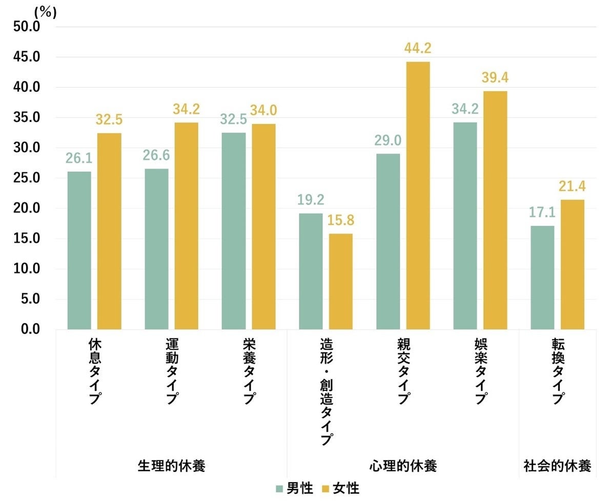 男女別で休養の7タイプの実施状況を見ていくと、男性は娯楽タイプ34.2%、栄養タイプ32.5%、女性は親交タイプ44.2%、娯楽タイプ39.4%が高い結果となった。多くの休養行動で女性の方が実践率が高くなっているが唯一、造形・創造タイプが男性の実施率が高い結果となった。